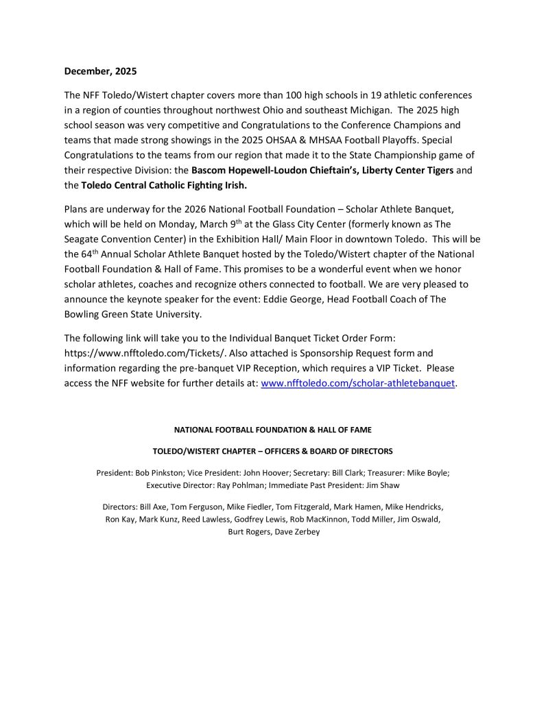 The NFF Toledo/Wistert chapter covers 98 high schools in 16 athletic conferences in a region of counties throughout northwest Ohio and southeast Michigan. The 2025 high school season was very competitive and Congratulations to the Conference Champions and teams that made strong showings in the 2025 OHSAA & MHSAA Football Playoffs.